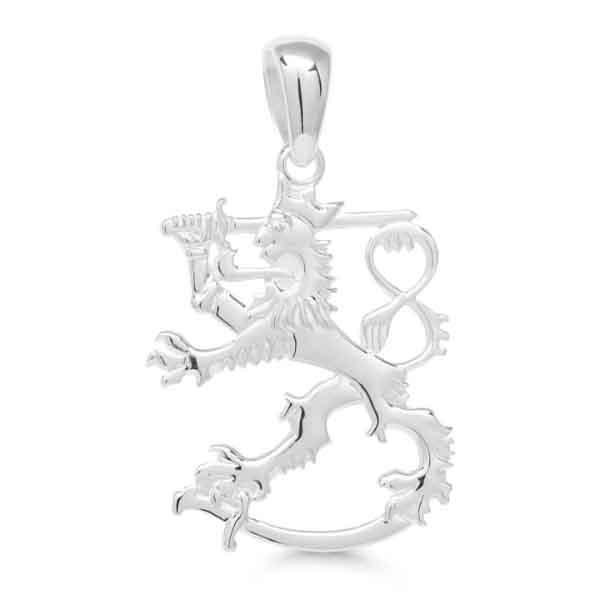 Klassinen Suomileijona-hopeariipus, jonka leveys on 27 mm ja korkeus 35 mm. Riipus on ostettavissa ilman ketjua tai 50 cm, 55 cm tai 60 cm pituisella hopeisella panssariketjulla.