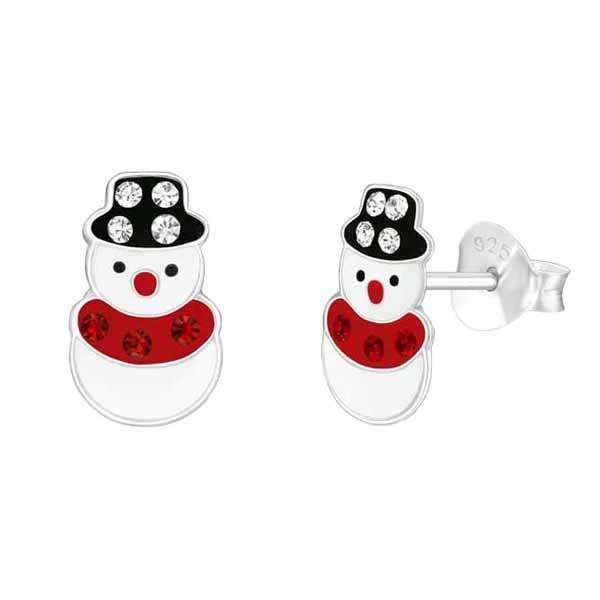 Lasten hopeiset lumiukko-korvakorut. Näissä jouluaiheisissa korvakoruissa esiintyy lumiukko punaisella kaulahuivilla ja mustalla hatulla. Korvakoruissa on luotettava tappikiinnitys. Joulu-korvakorujen koko on 6 x 10 mm. Sirot ja kevyet nappikorvakorut, joita lapsi voi käyttää arjessa! Korvakorujen valmistusmateriaali on laadukas nikkelitön 925 sterling hopea.