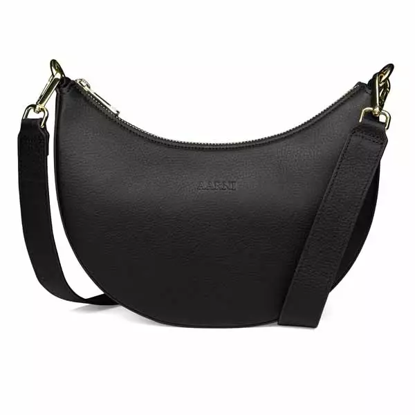 Kaunis puolikuun muotoinen Aarni Luna olkalaukku hurmaa tyylillään ja käytännöllisyydellään. Kaareva, puolikuun muotoinen design mukautuu kauniisti vartaloasi vasten. Aarnin Luna laukku on valmistettu laadukkaasta pohjoismaisesta Full Grain -naudannahasta. Laukku on mustan värinen kullan sävyisillä metalliosilla. Olkalaukun korttitaskut on RFID-suojattu eli etälukusuojattu, mikä estää korttiesi luvattoman skannaamisen. Laukun leveys on 25 cm, korkeus 18,5 cm ja syvyys 6,5 cm. Olkalaukussa on kätevä kullan sävyinen vetoketjusuljenta. Olkalaukun sisältä löytyvät kolme korttitaskua, avoin tasku sekä yksi vetoketjutasku. Laukussa on säädettävä nahkainen olkahihna, joka mahdollistaa laukun kantamisen usealla eri tyylillä. Olkalaukun hihnan pituus on säädettävissä kahdella eri jatkopalalla 97-117 cm sekä 50-65 cm välillä. Hihna on leveydeltään 2,8 cm. Aarni olkalaukku toimitetaan suojaavassa säilytyspussissa, joka on pakattu tyylikkääseen lahjakoteloon.