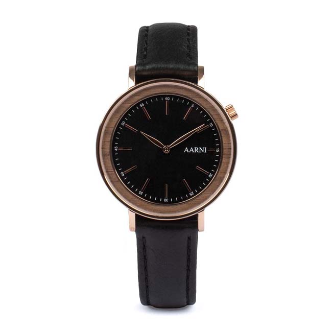 Naisten klassisen tyylikäs puukello, jossa yhdistyvät pähkinäpuu, musta kellotaulu ja hirvennahkaranneke. Kellossa on paristokäyttöinen kvartsikoneisto ja se on roiskevesisuojattu.