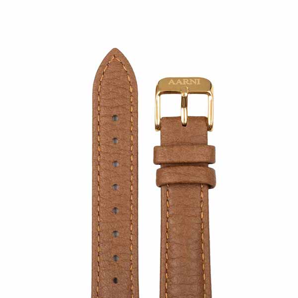 Tyylikäs Aarni nahkaranneke. Ranneke on valmistettu suomalaisesta hirvennahasta. Konjakin sävyinen nahkaranneke on 16 mm leveä ja pehmeytensä ansiosta erittäin miellyttävä käytössä. Hirvennahka kestää myös erinomaisesti sään ja kosteuden vaihtelua. Ranneke on helppo vaihtaa myös itse pikalukituksen avulla. Ranneke sopii Aarni Aurora, Saga ja Taiga malleihin sekä mihin tahansa kelloon, missä on 16 mm kiinnitys rannekkeelle.