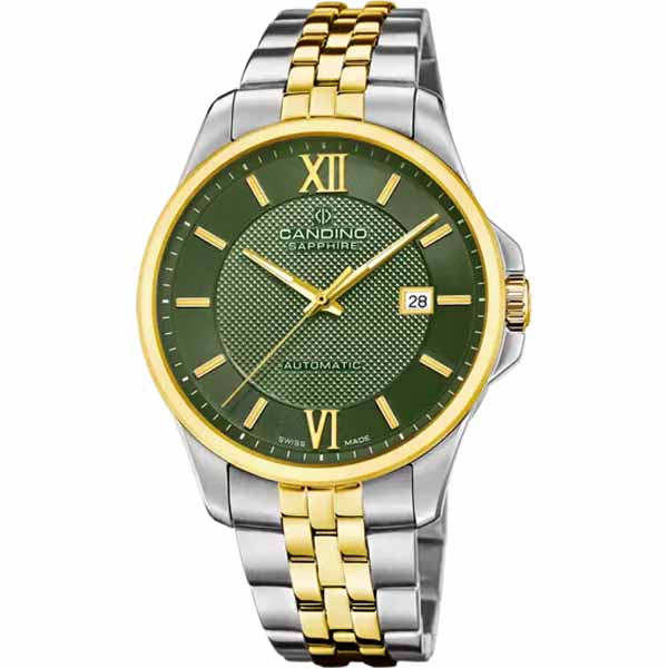Candinon miesten automaattikello vihreällä kellotaululla. 42 millimetriä leveässä kellossa on safiirilasi, joka suojaa kellotaulua erinomaisesti naarmuuntumista vastaan. Kellotaulussa on viivaindeksit poislukien kello 6 ja 12, jotka ovat roomalaisilla numerolla. Kellossa on päivyri kello 3 kohdalla. Kellon runko ja kaksivärinen ranneke ovat valmistettu ruostumattomasta teräksestä. Kellossa on laadukas ja tarkka sveitsiläinen Soprod P024 -automaattikoneisto, jonka toimintaa voit seurata lasisen takapohjen läpi. Kello on vesitiivis 50 metriin asti eli se kestää roiskevettä, mutta suihkuun tai uimiseen se ei sovellu.