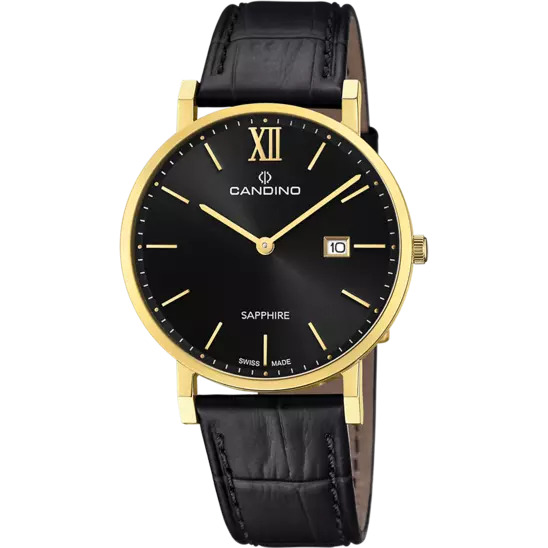 Candinon miesten kello mustalla kellotaululla ja mustalla nahkarannekkeella. 39,5 millimetriä leveässä kellossa on safiirilasi. Kellotaulussa on päivyri kello kolmen kohdalla.