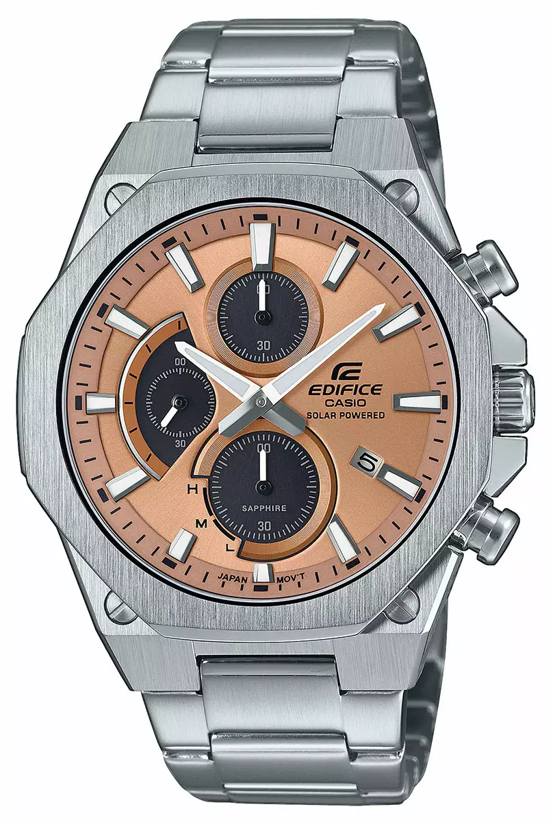 Auringonvalosta sekä keinovalosta virtansa ottava Casion analoginen Casio Edifice-rannekello ruusukullan sävyisellä kellotaululla. Kellosta löytyvät ajanottotoiminto sekä päivyri kello neljän kohdalta. Kellossa on hyvin käyttöä ja kulumista kestävä ruostumattomasta teräksestä valmistettu runko ja ranneke. Kellotaulua suojaa laadukas naarmuuntumaton safiirilasi. Kellon rungon leveys on 44 mm ja paksuus 9,7 mm. Kello on vesitiivis 10 bar, eli se kestää jopa pintauintia. Kellon paino on 133 grammaa. Kellossa on solar-koneisto, joten paristonvaihtoja ei tarvita.