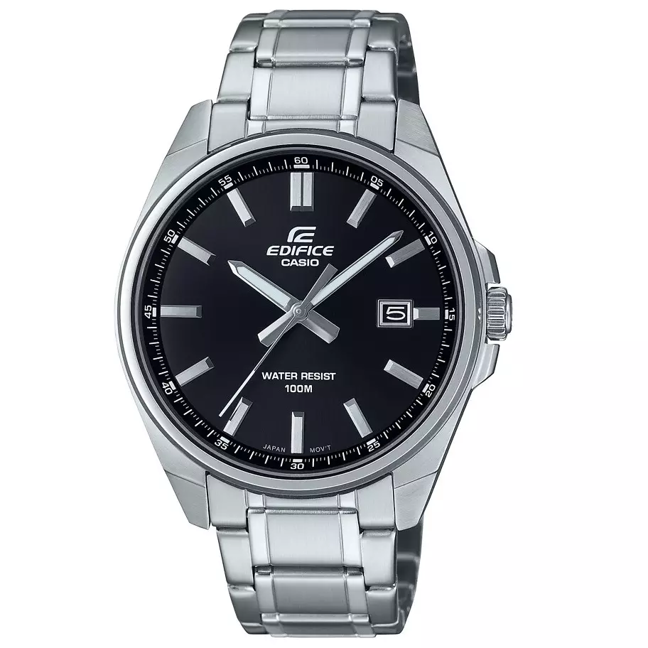 Casion analoginen Casio Edifice-rannekello mustalla kellotaululla. Kellossa on hyvin käyttöä ja kulumista kestävä ruostumattomasta teräksestä valmistettu runko ja ranneke. Kellotaulusta löytyy käytännöllinen päivyri kello kolmen kohdalta. Kellotaulua suojaa mineraalilasi. Kellon rungon leveys on 42,6 mm ja paksuus 9 mm. Kello on vesitiivis 10 bar, eli se kestää jopa pintauintia. Kellon paino on 113 grammaa. Kellossa on paristokäyttöinen kvartsikoneisto noin komen vuoden pariston kestolla.