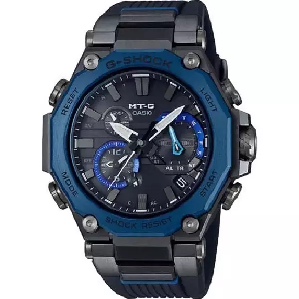 Iskunkestävä ja äärimmäisen monipuolinen Casio G-Shock MTG-B2000B-1A2ER kello monipuolisilla toiminnoilla. Kellon näyttävä sähkön sininen kehä istuu erinomaisesti ruostumattomasta teräksestä ja hiilivahvistetusta hartista tehtyyn runkoon. Kellon ranneke on valmistettu synteettisestä hartsista, jonka erittäin korkean kestävyyden ansiosta hartsi on ihanteellinen materiaali kelloille joiden odotetaan kestävän käyttöä kaikissa olosuhteissa. Hartsi sopii myös kellon rannekkeen materiaaliksi, sillä kestävyyden lisäksi sillä on myös joustavia ominaisuuksia. Kellon rungon leveys on 51 mm ja paksuus 15,9 mm, joten kyseessä on varsin kookas kello. Kello painaa 127 grammaa eli se ei ole mahdottoman painava, vaikka kello onkin kookas. Tämä G-Shock kello on vesitiivis 200 metriin asti ISO 22810 -standardin mukaisesti. Lue alta lisää kellon monipuolisista ominaisuuksista.