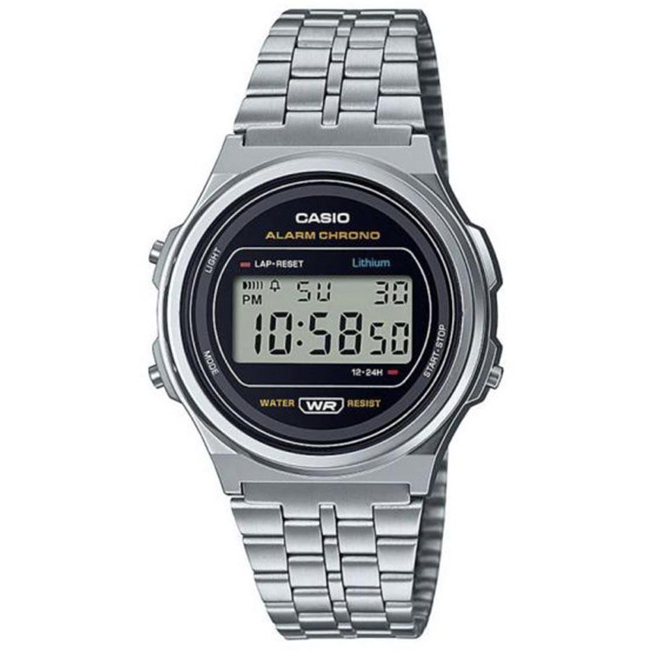 Miesten retrohenkinen digitaalinen rannekello kultaisen värisellä ruostumattomasta teräksestä valmistetulla rungolla. Kellossa mm. kalenteri, hälytys, ajanotto ja taustavalo....