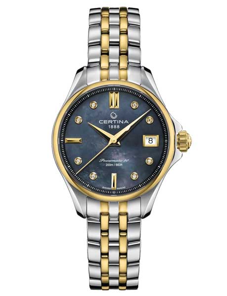 Certinan kaunis DS Action Lady kello kaksivärisellä rannekkeella. Kellossa on 34,5 mm leveä tummanpuhuva helmiäistaulu, jota suojaa erittäin kestävä safiirilasi. Ruostumattomasta teräksestä valmistettu kuori ja ranneke kestää käyttöä pitkään. Kellossa on keltakultaisia yksityiskohtia. Kellotauluun on istuettu kahdeksan loistavaa timanttia ja indeksit sekä osoittimet ovat keltakullan sävyiset. Kellossa on korkealaatuinen Powermatic 80.611 -automaattikoneisto, jossa on peräti 80 tunnin käyntivara!
