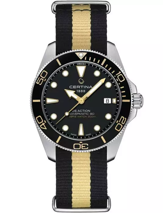 Uusi Certina DS Action Diver 40.5mm yhdistää ammattitason sukeltajankellon ominaisuudet ja sporttisen tyylikkyyden. Tämän mallin kestävä ja mukava NATO-ranneke on valmistettu synteettisestä materiaalista ja varustettu kätevällä pikakiinnitysjärjestelmällä. Kello on vesitiivis aina 300 metriin asti ja se hyödyntää Certinan viimeisintä innovaatiota, “New DS Concept Extreme Shock Resistance”, joka takaa poikkeuksellisen iskunkestävyyden. Kellon 40.5 mm leveä runko on valmistettu 316L-ruostumattomasta teräksestä. Syvänmustaa kellotaulua kehystää teräksinen, yksisuuntaisesti pyörivä kellonkehä, jossa on tyylikäs musta keraaminen insertti ja Super-LumiNova -merkintät. Kellotaulua suojaa heijastamattomalla pinnoitteella käsitelty naarmuuntumaton safiirilasi. Kellon sydämenä sykkii sveitsiläinen POWERMATIC 80.611 -automaattikoneisto, joka tarjoaa vaikuttavan 80 tunnin käyntivaran ja Nivachron-spiraalin ansiosta paremman suojan magneettikenttiä vastaan.
