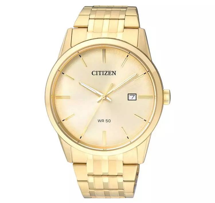 Citizen BI5002-57P on klassinen ja elegantti miesten rannekello, joka huokuu ajatonta tyyliä. Kellon runko ja ranneke on valmistettu laadukkaasta ruostumattomasta teräksestä ja päällystetty lämpimän kullan sävyllä. Kokonaisuuden viimeistelee upea samppanjanvärinen kellotaulu, jossa on selkeät viivaindeksit.