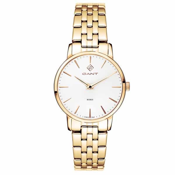 Klassisen tyylikäs Gantin naisten rannekello. Kellossa on ruostumattomasta teräksestä valmistettu kullan värinen runko ja ranneke. Valkoisen pyöreän kellotaulun halkaisija on 32 mm. Kellotaulusta löytyvät pelkistetyt kullan väriset viivaindeksit. Kello on roiskevesitiivis 5 bar. Rannekello saa virtansa paristolla toimivasta kvartsikoneistosta.