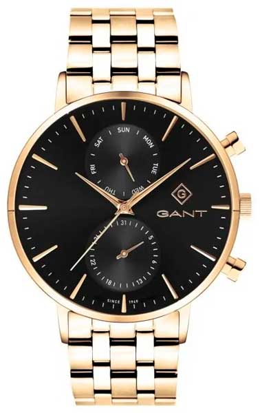 Gant miesten rannekello on tyylikäs miesten rannekello perinteisillä ominaisuuksilla. Tässä Park Hill Day-Date kellossa on tyylikäs musta kellotaulu kaksoispäivyrillä. Kellon runko ja ranneke on valmistetu ruostumattomasta teräksestä, joka on PVD-pinnoitettu kullan sävyiseksi. Kellon rungon halkaisija on 43,5 mm ja rannekkeen leveys 22 mm. Kellotaulun indeksit sekä osoittimet ovat kullan sävyiset. Kellossa on mineraalilasi ja se on roiskevesitiivis 5 bar. Kellossa on kvartsikoneisto japanilainen kvartsikoneisto, jonka tarkkuus on +/- 20 sekuntia kuukaudessa.