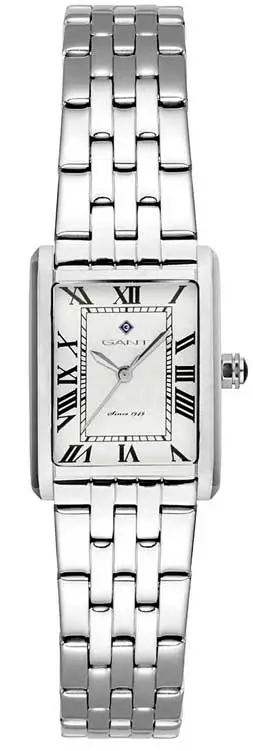 Siro ja tyylikäs Gant Seneca naisten rannekello. Kellossa on ruostumattomasta teräksestä valmistettu runko sekä ranneke. Kellon rungon leveys on 20,5 mm ja paksuus 7 mm. Valkoisesta kellotaulusta löytyvät mustat roomalaiset indeksit. Kello on vesitiivis 3 bar eli se on roiskevesitiivis. Rannekello saa virtansa paristolla toimivasta kvartsikoneistosta.