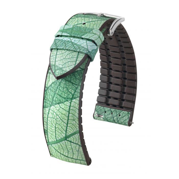 Ranneke on valmistettu luonnon inspiroimana. Tämän ranneke on valmistettu aidoista lehdistä ja on näin ollen ei sisällä eläinperäisiä materiaaleja. Rannekkeen alapinta on HIRSCH Premium Caoutchouc core uritettua luonnonkumia, jonka avulla kosteus siirtyy rannekkeen alta helposti.