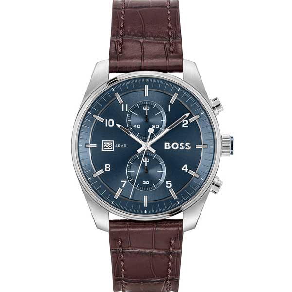 Hugo Boss miesten rannekello ajanottotoiminnolla sekä päivyrillä. Kellossa on kestävästä ruostumattomasta teräksestä valmistettu runko sekä ruskea nahkaranneke. Kellon rungon halkaisija on 44 mm ja paksuus 11 mm. Kellotaulu on sävyltään sininen. Kellossa on paristokäyttöinen kvartsikoneisto ja se on roiskevesitiivis 5 bar.