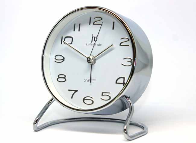 JM hopean värinen herätyskello valkoisella kellotaululla ja modernilla muotoilulla. Herätyskellossa on beep-hälytysääni ja sen osoittimet ovat hiljaiset. Herätyskellon mitat ovat 10 x 12 x 8 cm.