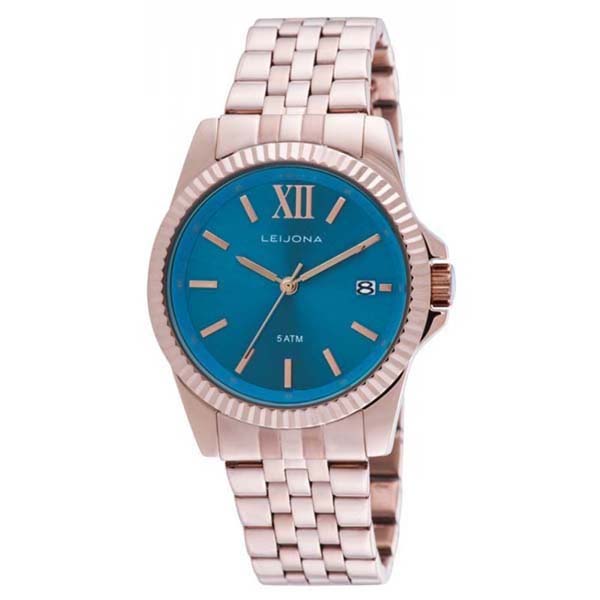 Tyylikäs naisten rannekello punakullatulla teräsrannekkeella. Rannekellossa on 29 mm leveä turkoosi kellotaulu sekä päivyri kello kolmen kohdalla. Kello on vesitiivis 50 metriin saakka! Sopii niin arkeen kuin juhlaan!