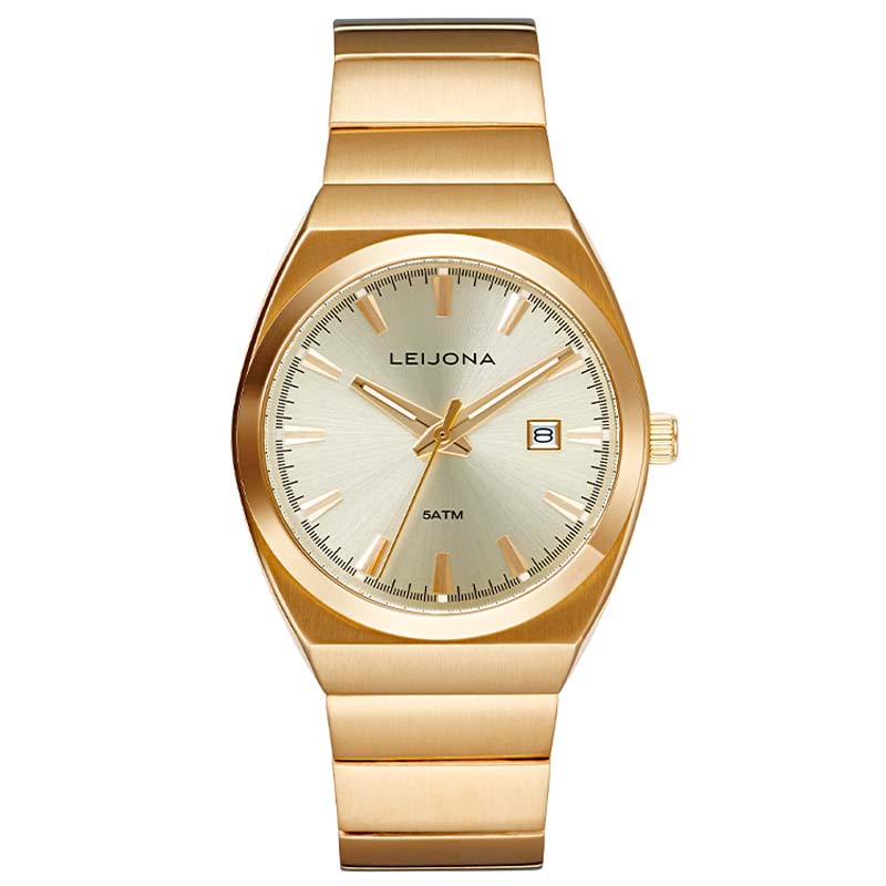 Leijona Iniö tyylikäs naisten rannekello kullatulla teräsrannekkeella. Rannekellossa on 32 mm leveä samppanjan värinen kellotaulu sekä päivyri kello kolmen kohdalla. Kello on vesitiivis 50 metriin saakka!