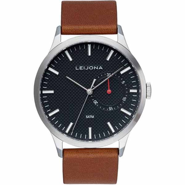 Miesten Leijona rannekello ruskealla nahkarannekkeella ja mustalla taululla. Koivusuo kellossa on kestävästä ruostumattomasta teräksestä valmistettu runko sekä nahkainen ranneke. Kellossa on 40 mm leveä musta kellotaulu, jota suojaa mineraalilasi. Kellotaulusta löytyy kätevä päivyri. Kello on suojattu roiskevedeltä 5 bar. Rannekello saa virtansa paristolla toimivasta kvartsikoneistosta. Voit valita kaiverruspalvelun tähän kelloon!