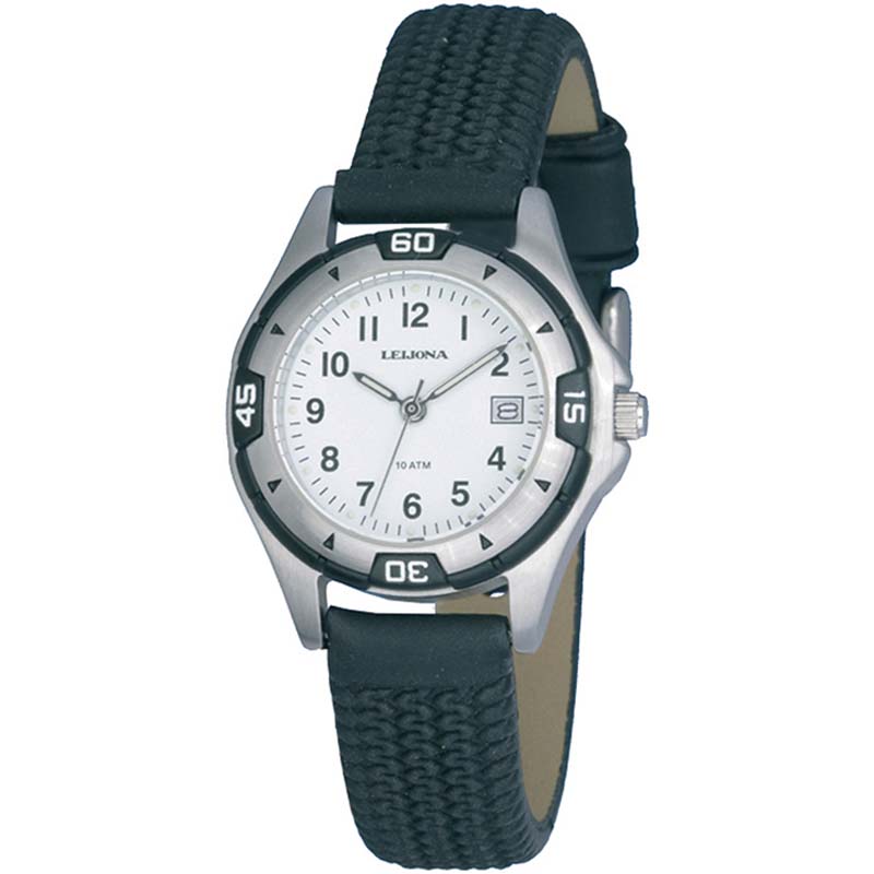 Lasten rannekellossa on miellyttävä nahkaranneke. Teräsrunko ja valkoinen 29 mm kellotaulu. Selkeät ja suuret mustat numerot. Kellossa on päivämääränäyttö kello kolmen kohdalla! Kello on vesitiivis 100 metriin saakka, joten se kestää pintauimista!