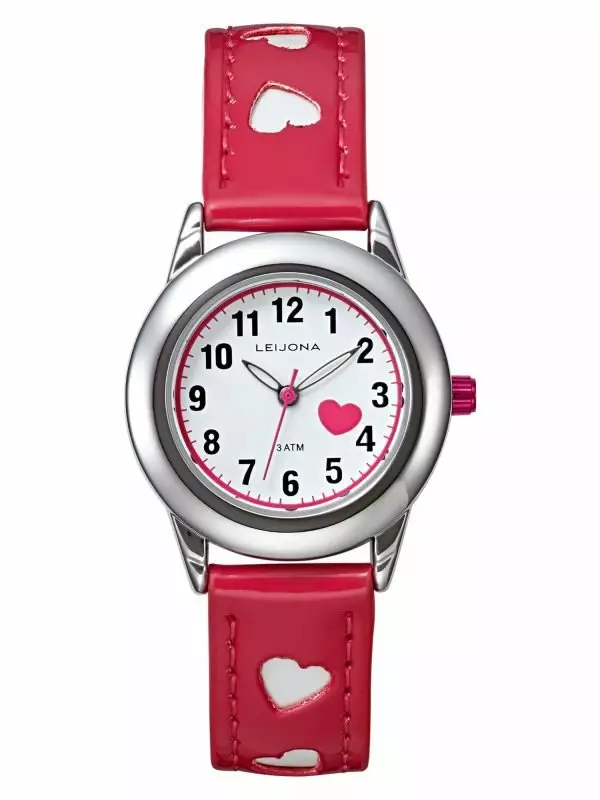 Hempeä lasten rannekello sydänkuvioinnilla ja vaaleanpunaisella nahkarannekkeella. Selkeän valkoisen kellotaulun indeksit ovat numeroita, ja kellotaulussa on pinkki sydän. Kellotaulun koko on 28 mm ja sitä suojaa mineraalilasi. Kellon koneisto kestää roiskevettä.