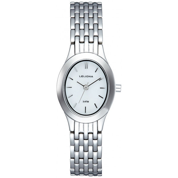 Naisten teräksisen värinen soikeatauluinen rannekello, jossa on 21,5 mm valkoinen kellotaulu. Kello on vesitiivis 30 metriin saakka sekä kellolle myönnetään 2 vuoden takuu!