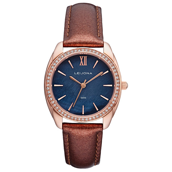 Tyylikäs naisten rannekello nahkarannekkeella. Rannekellossa on 31 mm leveä sininen kellotaulu. Kello on vesitiivis 50 metriin saakka!