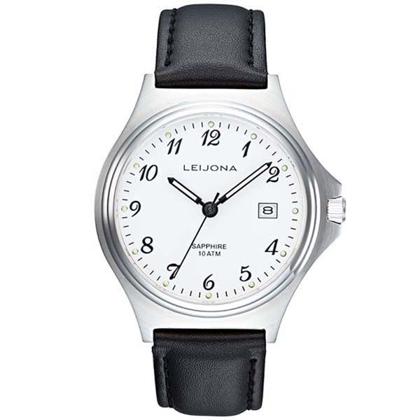 Klassinen miesten rannekello nahkarannekkeella. Rannekellossa on 37 mm leveä valkoinen kellotaulu kestävällä safiirilasilla, sekä selkeälukuinen päivyri kello kolmen kohdalla. Kello on vesitiivis 100 M asti, joten se kestää hyvin pintauimista.