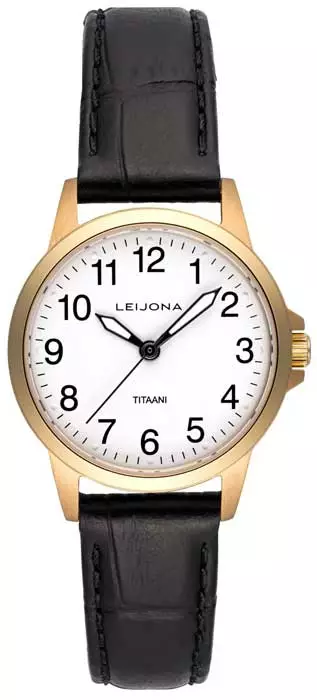 Tämä elegantti Leijona Ruokolahti naisten rannekello (malli 5180-01-471-7A) on valmistettu kevyestä ja miellyttävän tuntuisesta titaanista, joka sopii erinomaisesti myös herkkäihoisille. Kellon titaanirunko, jonka halkaisija on siro 28 mm, on kullanvärinen, joka tuo ilmeeseen syvyyttä. Se sopii kauniisti pienempäänkin ranteeseen. Selkeää valkoista kellotaulua koristavat hyvin luettavat arabialaiset numerot sekä pimeässä hohtavat luminoivat osoittimet ja indeksit. Kellotaulua suojaa erittäin kestävä ja naarmuuntumaton safiirilasi. Kellon ulkonäön viimeistelee ajaton musta nahkaranneke. Kellon voimanlähteenä toimii tarkka ja luotettava GL32-kvartsikoneisto. Vesitiiviys on 5 ATM (50 metriä), joten kello kestää hyvin arjen kosteuden ja roiskeet.