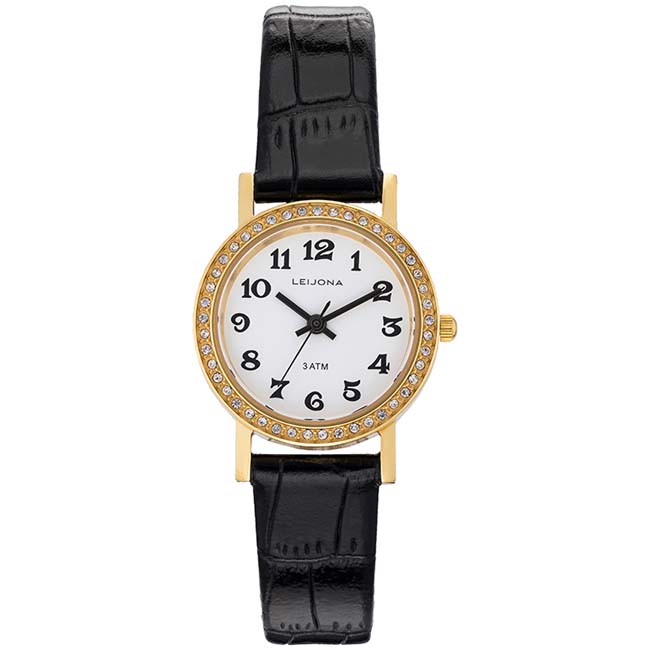 Klassinen naisten Leijona rannekello, jossa on 27 mm valkoinen kellotaulu. Kello on vesitiivis 30 metriin saakka sekä Leijona kelloille myönnetään kahden vuoden takuu!