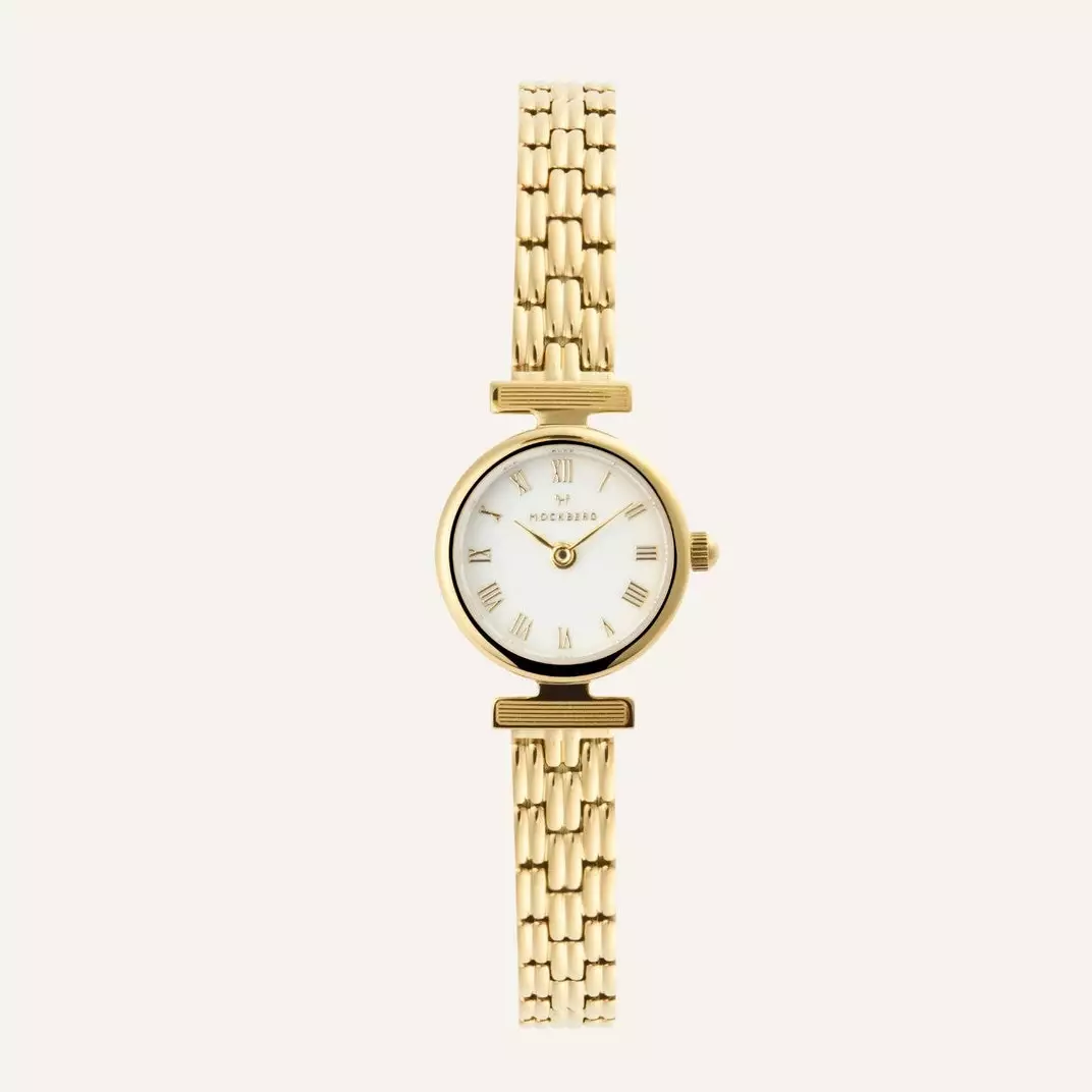 Mockberg Vintage -kello on ajattoman tyylikäs kello, jossa on ripaus klassista estetiikkaa. Sen siro, pyöreä runko, tyylikkäät roomalaiset numerot ja kiiltävä kullanvärinen ranneke tekevät siitä hienostuneen ja korumaisen lisän asuun kuin asuun. Klassinen valkoinen kellotaulu, kullanvärinen runko ja luotettava japanilainen koneisto tekevät siitä ajattoman ja varman valinnan.