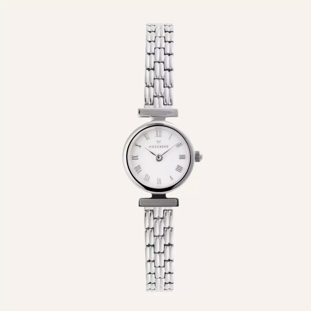 Mockberg Vintage -kello on ajattoman tyylikäs kello, jossa on ripaus klassista estetiikkaa. Sen siro, pyöreä runko, tyylikkäät roomalaiset numerot ja kiiltävä teräksenharmaa ranneke tekevät siitä hienostuneen ja korumaisen lisän asuun kuin asuun. Klassinen valkoinen kellotaulu, teräksenharmaa runko ja luotettava japanilainen koneisto tekevät siitä ajattoman ja varman valinnan.