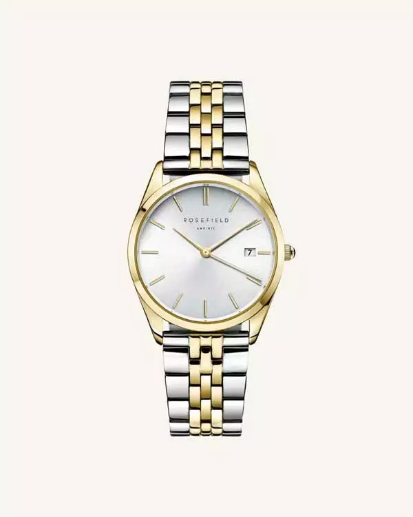 Rosefield Ace mallisto on kunnianosoitus rennon urheilulliselle athleisure-trendille. Tämä retrohenkinen kello on saanut modernin Rosefield-vivahteen, tehden siitä vaivattoman ja monipuolisen asusteen. Kellon näyttävä ilme syntyy lämpimän kullanvärisen messinkirungon ja elegantin kaksivärisen rannekkeen yhdistelmästä, jossa hopean ja kullan sävyt vuorottelevat kauniisti. Selkeä valkoinen kellotaulu ja kätevä päivämääränäyttö viimeistelevät kokonaisuuden, joka sopii täydellisesti niin sporttiseen kuin eleganttiinkin tyyliin.