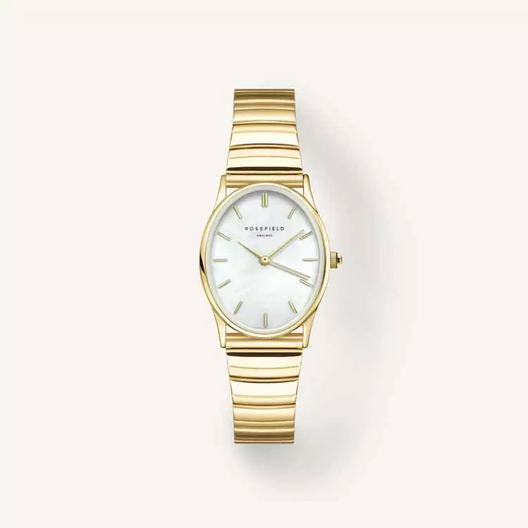 Rosefield Oval Pearl on ylellinen naisten rannekello, joka yhdistää klassisen ovaalinmuotoisen muotoilun ja upean helmiäiskellotaulun. Kellon kullanvärinen runko on valmistettu messingistä, ja sitä täydentää 23 karaatin kullalla pinnoitettu ruostumattomasta teräksestä valmistettu ranneke. Hohtava helmiäistaulu elää kauniisti valossa, tehden jokaisesta kellosta yksilöllisen. Tämä kello on elegantti valinta, joka tuo ripauksen luksusta jokaiseen asuun. Ranneke on helposti vaihdettavissa Boxy XS, Octagon ja Oval -mallistojen rannekkeisiin.
