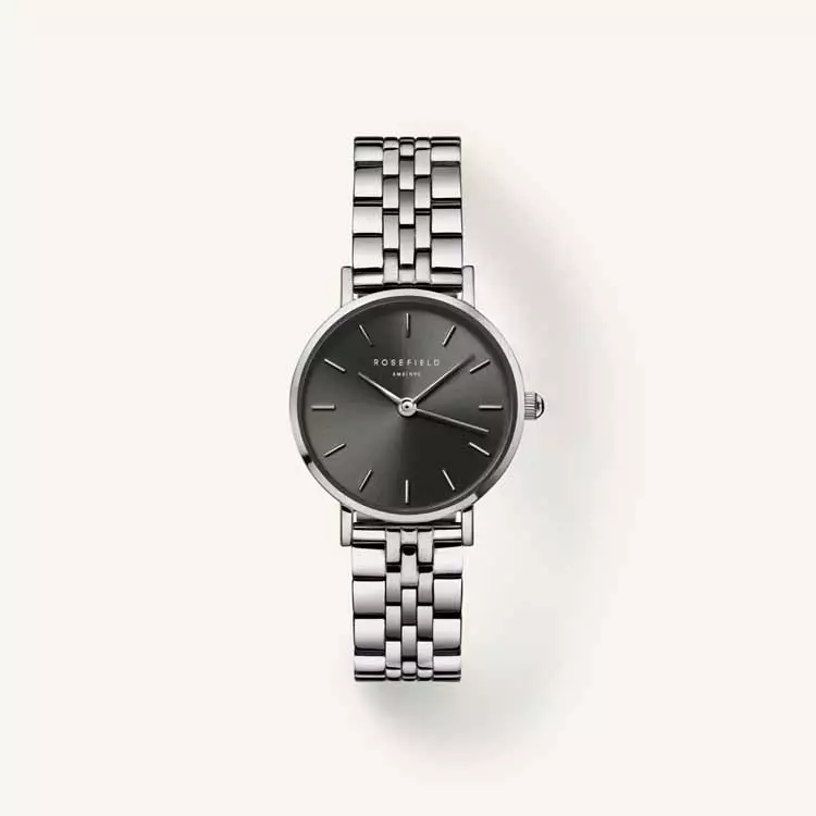Rosefield Small Edit : mallisto uudistaa klassisen tyylin moderniin aikakauteen. Vain 26 mm leveä runko tekee tästä kellosta yhden Rosefieldin siroimmista malleista, ja se onkin suunniteltu istumaan täydellisesti kapeampaankin ranteeseen. Kellon tyylikäs ilme syntyy hopeanvärisen messinkirungon ja upean, harmaan aurinkohiotun kellotaulun yhdistelmästä. Kokonaisuuden viimeistelee laadukas, rodiumpinnoitettu ruostumattomasta teräksestä valmistettu ranneke.