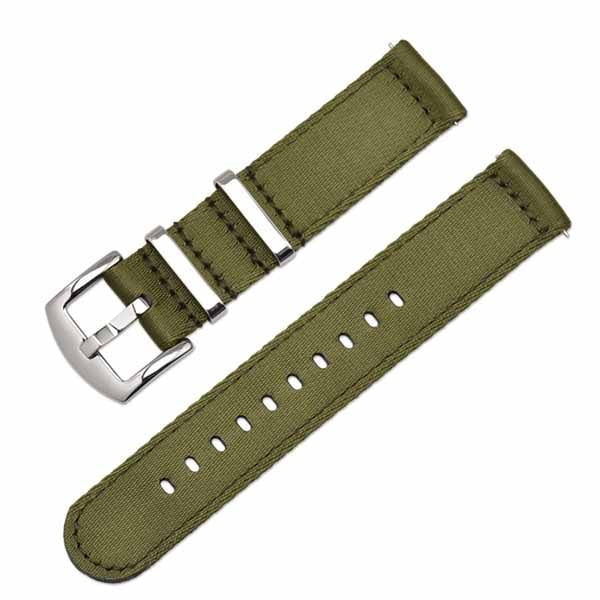 Vihreä kangasranneke kestävillä teräksisillä rannekelenkeillä. Tukevan rannekken paksuus on noin 3 mm. Ranneke on valmistettu kestävästä tekstiilistä, ja sen pinnan tuntuma on miellyttävän sileä. Kangasranneke on kevyt ja se hylkii likaa ja hikeä. Rannekkeen solki materiaaliltaan ruostumatonta terästä ja se on hopean sävyinen. Rannekkeen leveys on valittavissa, joko 18 mm, 20 mm tai 22 mm. Rannekkeen kokonaispituus on 205 mm. Rannekkeessa on pikakiinnitys eli se on helppo vaihtaa kelloon ilman työkaluja.
