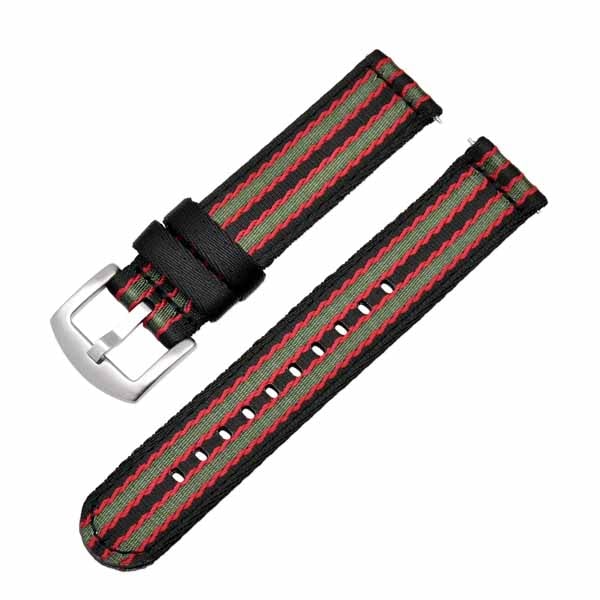 Musta-puna-vihreä kangasranneke kankaisilla rannekelenkeillä. Tukevan rannekken paksuus on noin 3 mm. Ranneke on valmistettu kestävästä tekstiilistä, ja sen pinnan tuntuma on miellyttävän sileä. Kangasranneke on kevyt ja se hylkii likaa ja hikeä. Rannekkeen solki materiaaliltaan ruostumatonta terästä ja se on hopean sävyinen. Rannekkeen leveys on valittavissa, joko 18 mm, 20 mm tai 22 mm. Rannekkeen kokonaispituus on 205 mm. Rannekkeessa on pikakiinnitys eli se on helppo vaihtaa kelloon ilman työkaluja.