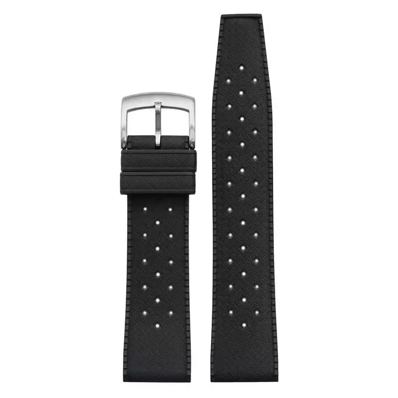 Tämä ajattoman musta FKM-kumiranneke määrittelee monikäyttöisyyden uudelleen. Se on samanaikaisesti hillitty, mutta yksityiskohtiensa ansiosta täynnä luonnetta. Sen erottuva luonne rakentuu kahdesta avainelementistä: pinnan hillitystä, kangasmaisesta tekstuurista sekä läpi rannekkeen kulkevasta vinoneliön muotoisesta rei'ityksestä. Tämä yhdistelmä luo visuaalisesti rikkaan ja miellyttävän tuntuisen kokonaisuuden, joka on samalla äärimmäisen hengittävä ja mukava. Geometrinen reikäkuvio antaa rannekkeelle dynaamisen ja sporttisen ilmeen. Rannekkeen paksuus on noin 2 mm ja se on saatavilla 20 mm ja 22 mm leveyksissä.