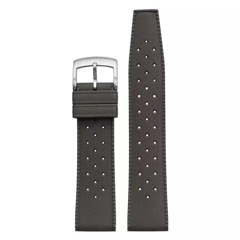 Tämä ruskea FKM-kumiranneke määrittelee monikäyttöisyyden uudelleen. Se on samanaikaisesti hillitty, mutta yksityiskohtiensa ansiosta täynnä luonnetta. Sen erottuva luonne rakentuu kahdesta avainelementistä: pinnan hillitystä, kangasmaisesta tekstuurista sekä läpi rannekkeen kulkevasta vinoneliön muotoisesta rei'ityksestä. Tämä yhdistelmä luo visuaalisesti rikkaan ja miellyttävän tuntuisen kokonaisuuden, joka on samalla äärimmäisen hengittävä ja mukava. Geometrinen reikäkuvio antaa rannekkeelle dynaamisen ja sporttisen ilmeen. Rannekkeen paksuus on noin 2 mm ja se on saatavilla 20 mm ja 22 mm leveyksissä.