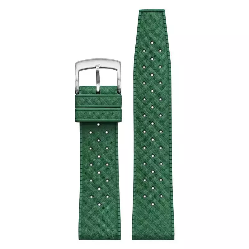 Tämä syvänvihreä FKM-kumiranneke määrittelee monikäyttöisyyden uudelleen. Se on samanaikaisesti hillitty, mutta yksityiskohtiensa ansiosta täynnä luonnetta. Sen erottuva luonne rakentuu kahdesta avainelementistä: pinnan hillitystä, kangasmaisesta tekstuurista sekä läpi rannekkeen kulkevasta vinoneliön muotoisesta rei'ityksestä. Tämä yhdistelmä luo visuaalisesti rikkaan ja miellyttävän tuntuisen kokonaisuuden, joka on samalla äärimmäisen hengittävä ja mukava. Geometrinen reikäkuvio antaa rannekkeelle dynaamisen ja sporttisen ilmeen. Rannekkeen paksuus on noin 2 mm ja se on saatavilla 20 mm ja 22 mm leveyksissä.