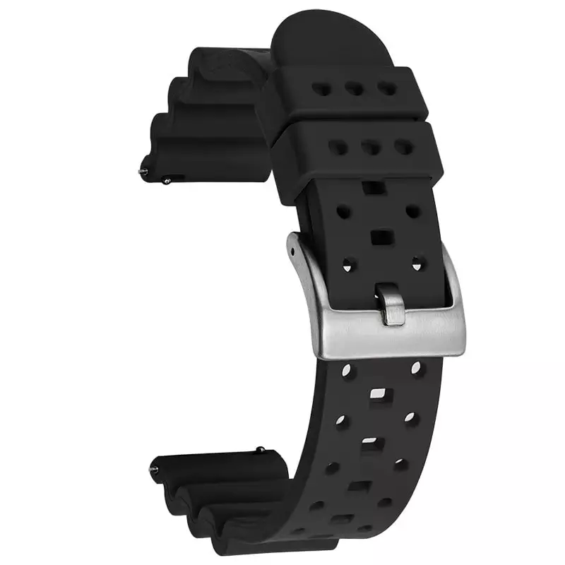 Tämä ranneke on suunniteltu kestämään. Ensiluokkainen FKM-kumi hylkii tehokkaasti pölyä ja likaa, ja se on täysin immuuni vedelle, hielle, UV-säteilylle sekä arjen kemikaaleille. Voit siis nauttia aktiivisesta elämästä ja pitää kellosi ranteessa tilanteesta riippumatta, oli kyseessä sitten urheilusuoritus, uimareissu tai toimistopäivä. Rannekkeen takaosan rei'itys parantaa hengittävyyttä merkittävästi, mikä tekee siitä miellyttävän valinnan myös lämpimällä säällä. Rannekkeen kellon puoleisissa päissä on tyylikäs aaltoileva muotoilu, joka istuu saumattomasti ja viimeistellysti kelloosi.