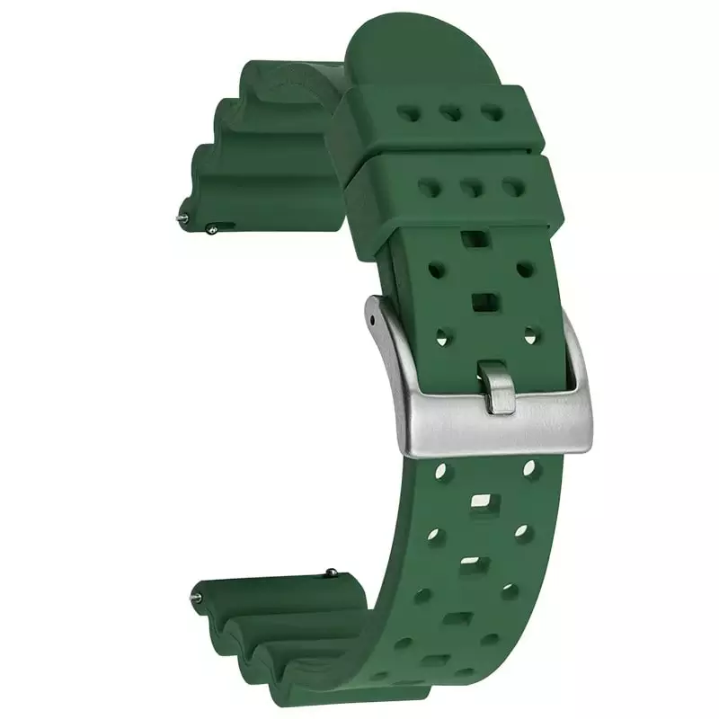 Päivitä kellosi ilme ja käyttömukavuus täysin uudelle tasolle tällä syvänvihreällä FKM-kumirannekkeella. Heti ensikosketuksesta huomaat, miksi korkealaatuinen FKM-kumi on niin haluttu materiaali. Se tuntuu ranteessa poikkeuksellisen pehmeältä ja joustavalta, mukautuen täydellisesti juuri sinun ranteeseesi ilman hiertämistä tai epämukavuutta. Rannekkeen paksuus on noin 3 mm ja se on saatavilla 20 mm ja 22 mm leveyksissä.