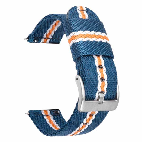 Sininen kangasranneke oranssilla ja valkoisilla raidoilla. Tukevan rannekken paksuus on 3 mm. Ranneke on valmistettu kestävästä tekstiilistä. Kangasranneke on kevyt ja se hylkii likaa ja hikeä. Rannekkeen solki on hopean sävyinen. Rannekkeen leveys on valittavissa, joko 18 mm, 20 mm, 22 mm tai 24 mm. Rannekkeen kokonaispituus on 205 mm. Rannekkeessa on pikakiinnitys eli se on helppo vaihtaa kelloon ilman työkaluja.