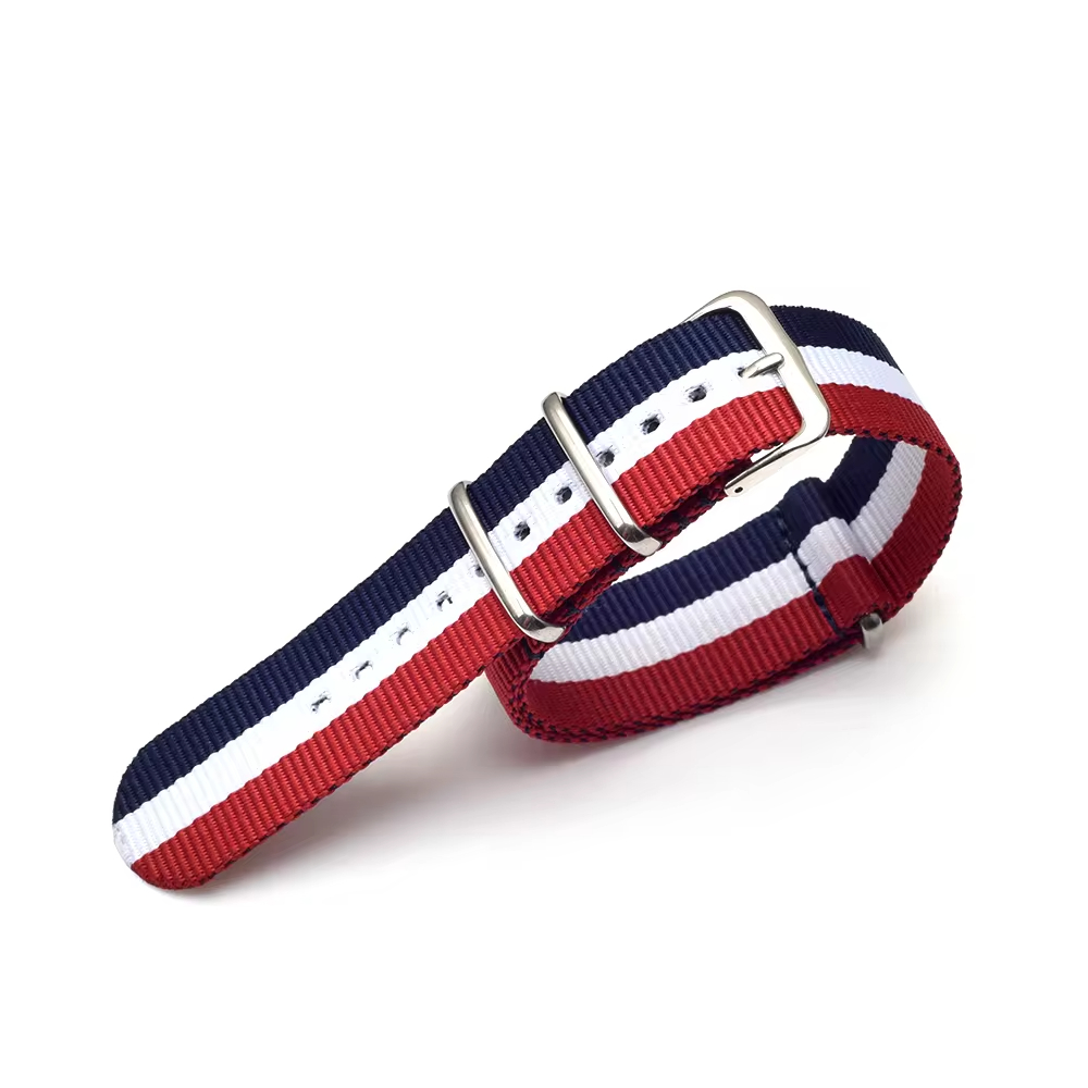 Puna-valko-sini-raidallinen nato-ranneke, joka on valmistettu kestävästä nailonista. Nylonranneke on kevyt ja se hylkii likaa ja hikeä. Rannekkeen kokonaispituus on 255 mm.