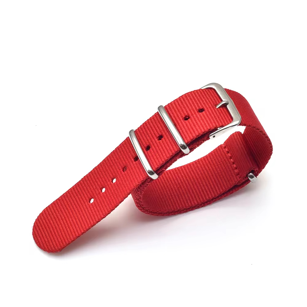 Punainen nato-ranneke, joka on valmistettu kestävästä nailonista. Nylonranneke on kevyt ja se hylkii likaa ja hikeä. Rannekkeen kokonaispituus on 255 mm. Hopean värinen solki.