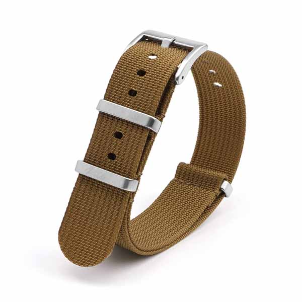 Ruskea nato-ranneke tukevilla ruostumattomasta teräksestä valmistetuilla rannekelenkeillä. Nylonranneke on kevyt ja se hylkii likaa ja hikeä. Rannekkeen pituus on noin 270 mm.