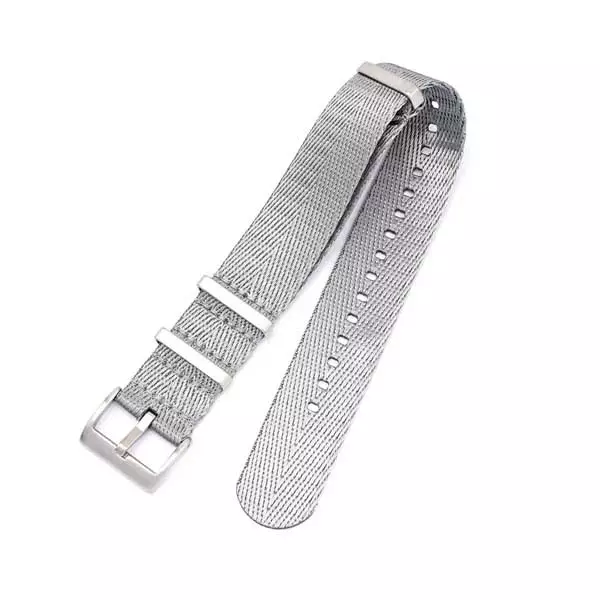 Harmaa nato-ranneke sileällä tuntumalla ja tukevilla ruostumattomasta teräksestä valmistetuilla rannekelenkeillä. Rannekkeen leveys on valittavissa, joko 20 mm tai 22 mm.