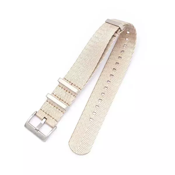 Hiekan värinen nato-ranneke sileällä tuntumalla ja tukevilla ruostumattomasta teräksestä valmistetuilla rannekelenkeillä. Rannekkeen leveys on valittavissa, joko 20 mm tai 22 mm.