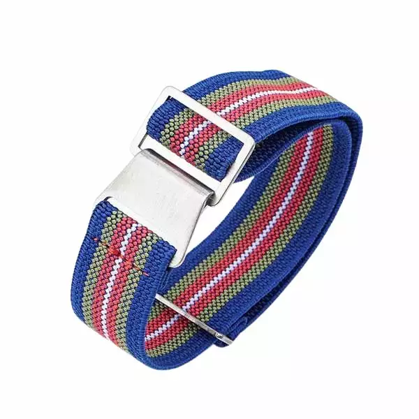Raidallinen, sini-vihre-puna-valkoinen joustava nato-ranneke. Ranneke on paksuudeltaan noin 1,5 mm ja se on valmistettu kestävästä ja venyvästä nailonista. Rannekkeen terässolki on hopean sävyinen. Rannekkeen leveys on valittavissa, joko 18 mm, 20 mm tai 22 mm. Ranneke sopii myös hyvin isoille ranteille. Säädettävä ranneke sopii ranteille, joiden ympärysmitta on alkaen noin 17 cm. Pienimpään mahdolliseen ympärysmittaan vaikuttaa myös kellon halkaisija. Nylonranneke on kevyt ja se hylkii likaa ja hikeä.
