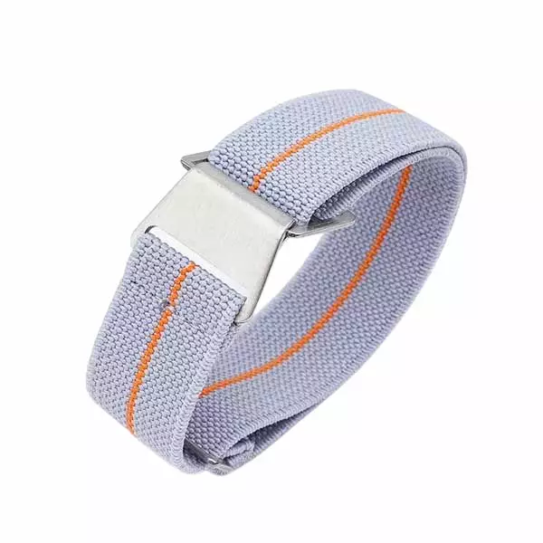 Siniharmaa joustava nato-ranneke oranssilla raidalla. Ranneke on paksuudeltaan noin 1,5 mm ja se on valmistettu kestävästä ja venyvästä nailonista. Rannekkeen terässolki on hopean sävyinen. Rannekkeen leveys on valittavissa, joko 18 mm, 20 mm tai 22 mm. Ranneke sopii myös hyvin isoille ranteille. Säädettävä ranneke sopii ranteille, joiden ympärysmitta on alkaen noin 17 cm. Pienimpään mahdolliseen ympärysmittaan vaikuttaa myös kellon halkaisija. Nylonranneke on kevyt ja se hylkii likaa ja hikeä.